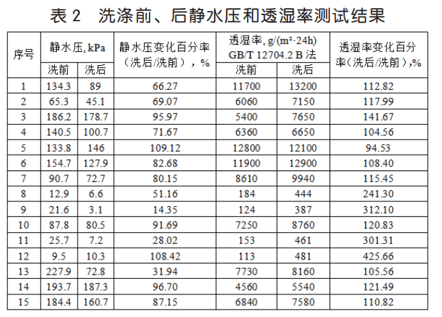 以筆者所在的檢測機(jī)構(gòu)為例,收集了一定時(shí)間內(nèi)的沖鋒衣面料檢測樣品,共計(jì) 50 個(gè),其中 35 個(gè)樣品采用上述方法,進(jìn)行靜水壓和透濕率測試,研究不同方法之間的關(guān)系,結(jié)果見表 1。15 個(gè)樣品按照GB/T 32614-2016《戶外運(yùn)動(dòng)服裝 沖鋒衣》測試比較樣品洗滌前、后的靜水壓和透濕率變化,結(jié)果見表 2。