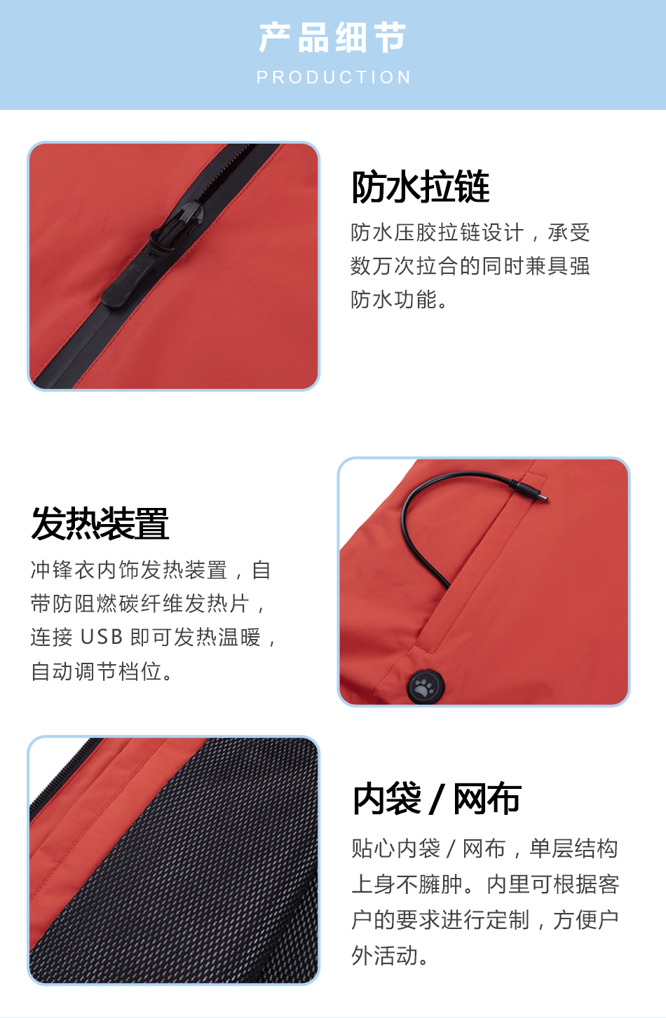 發熱裝置:沖鋒衣內設發熱裝置,自帶防阻燃碳纖維發熱片,連接USB即可發熱溫暖,自動調節檔位。